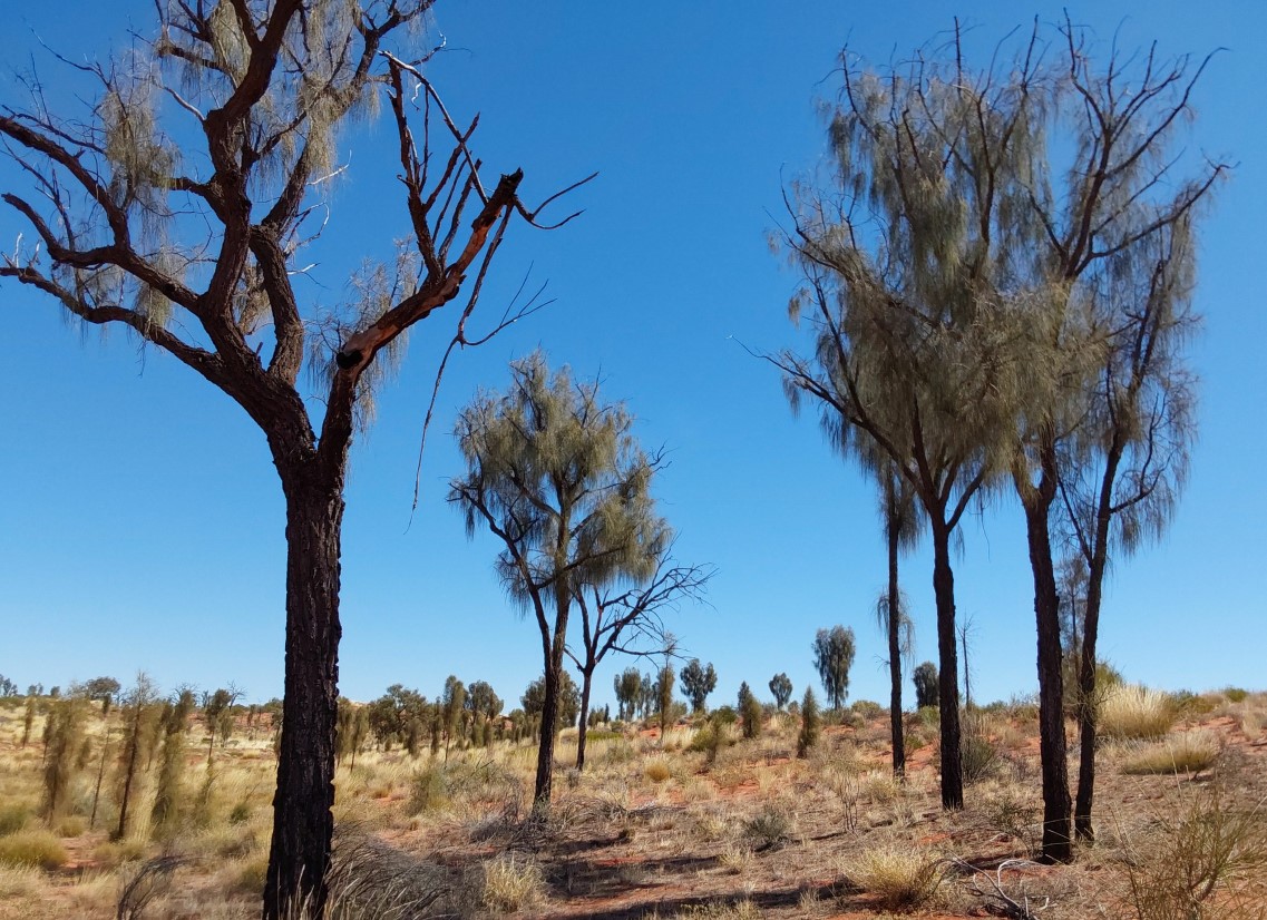 The most recent example occurred in 2017/18-2020 when much of eastern and central Australia was gripped by one of the most severe droughts on record. At Uluru-Kata Tjuta National Park, Northern Territory, virtually no rain fell in 2018, and by 2019 vegetation across the Park was showing signs of severe stress. By 2020 mortality of trees, shrubs and grasses had become widespread, affecting dominant species like desert oak (Allocasuarina decaisneana), mulga (Acacia aneura) and spinifex (Triodia spp.).