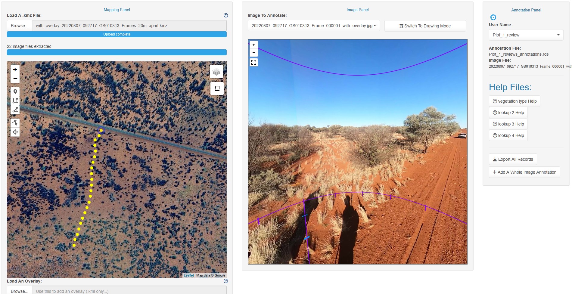 Over the next few months we used the pannotator package to annotate more than 5,000 images from the transect with data for >10 species, and exported the data. Crucially, each annotation contained extremely precise grid coordinates (lat/long) derived from the GPS of the GoPro Max, which allowed us to begin the more detailed process of mapping drought impacts across the study area based on these data points.